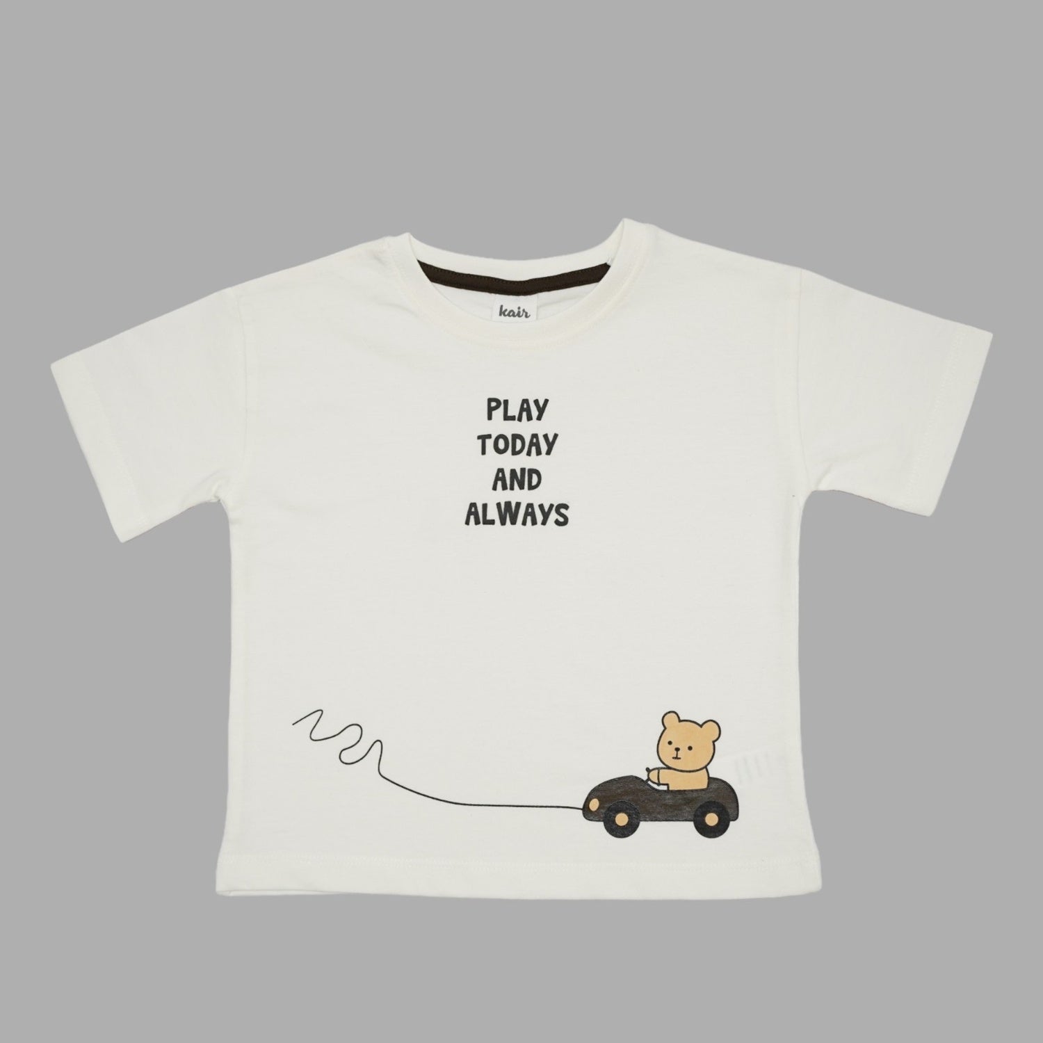 Add a playful touch to everyday style with this charming graphic T-shirt. Designed in a soft white shade, it features the uplifting message “Play Today and Always” along with a cute illustration of a teddy bear driving a little car. Made from soft, breathable fabric, this tee ensures all-day comfort for active little ones.