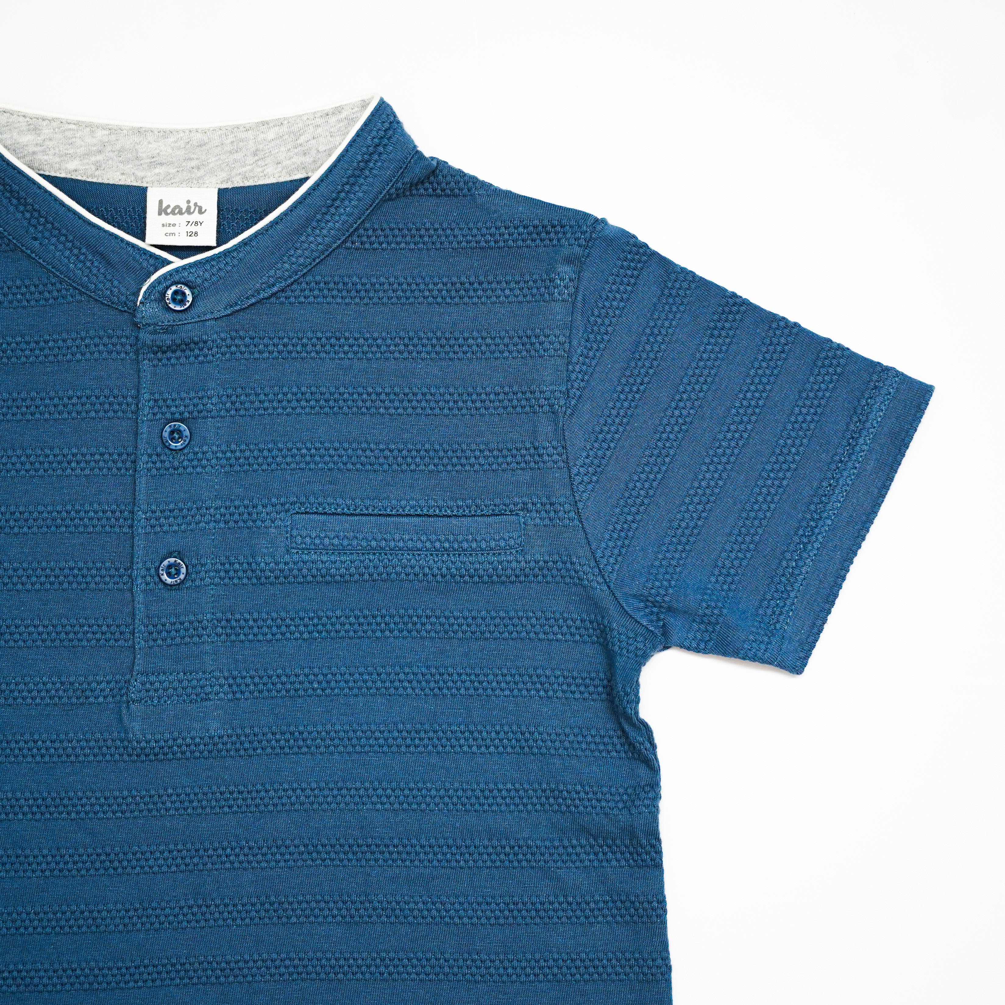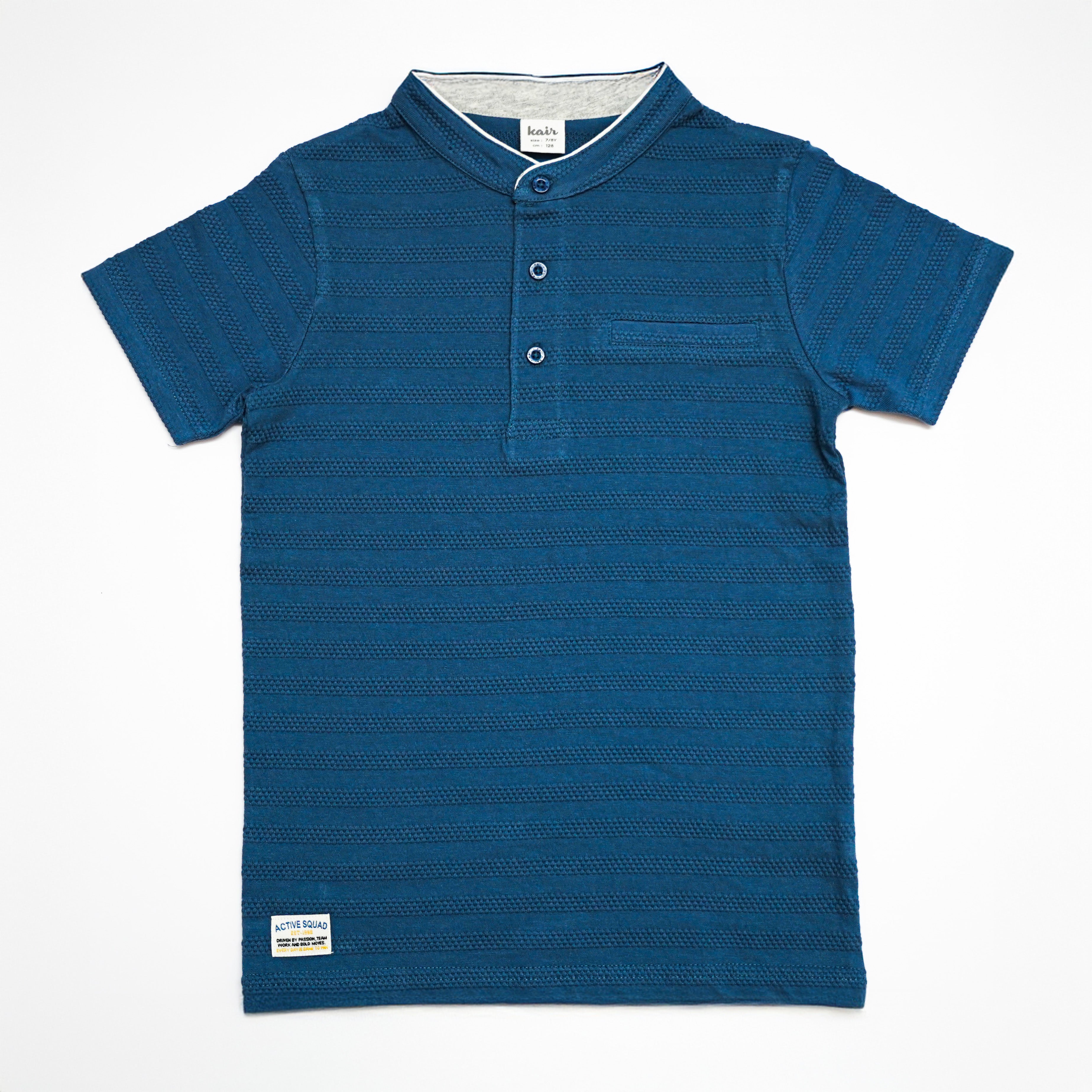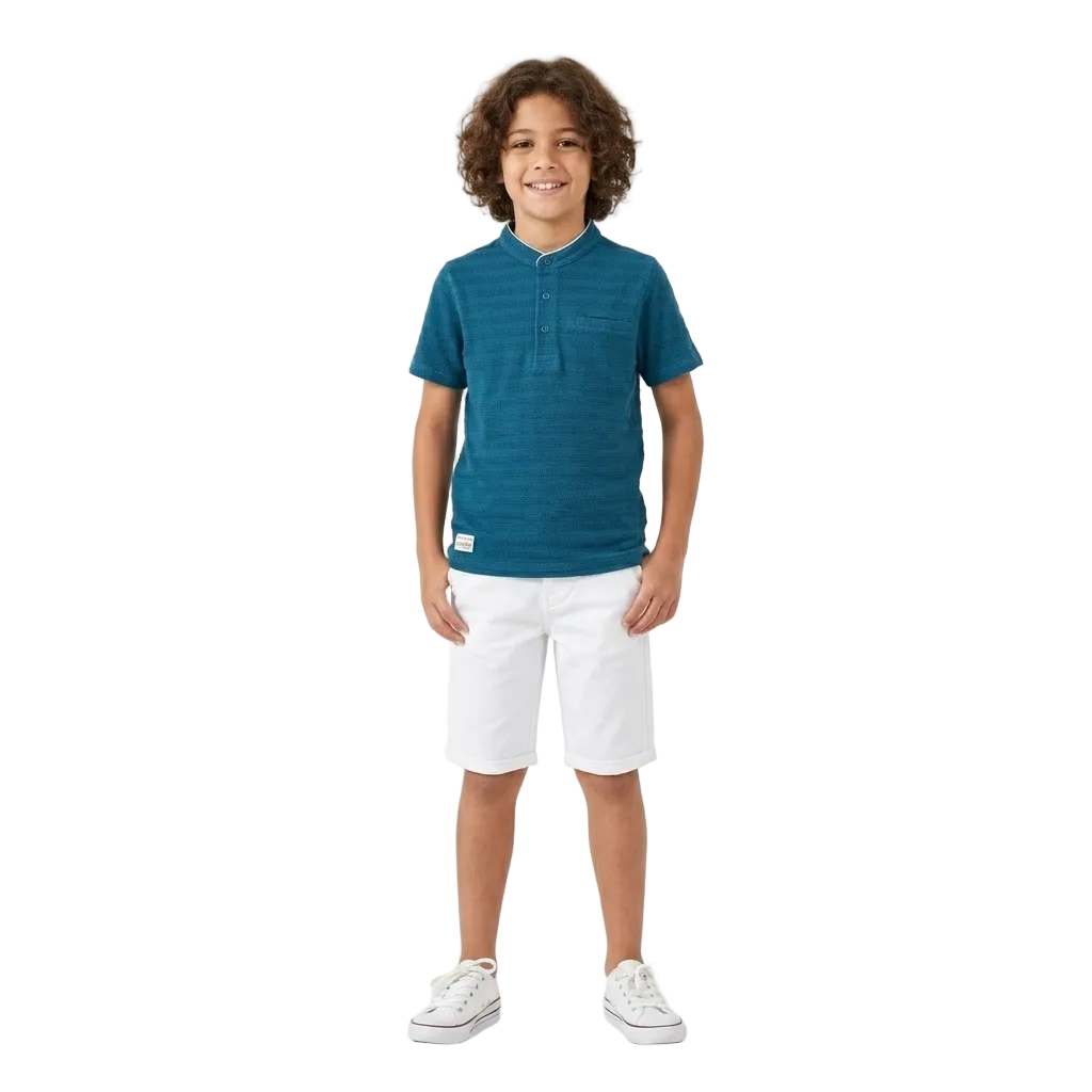 A stylish short-sleeve T-shirt designed with a mandarin collar and textured fabric for a modern smart-casual look. The button placket and subtle chest pocket detail add a refined touch, making it perfect for both everyday wear and slightly dressier occasions.