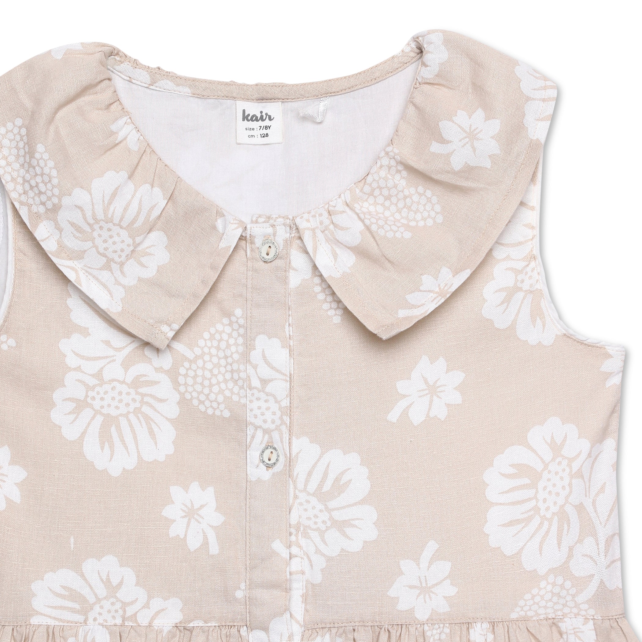Add a delightful charm to your little girl’s summer wardrobe with this sleeveless sand dress featuring a charming white floral print, made from a soft linen-cotton blend with a gathered waist for a twirl-worthy skirt, a button-down front for easy dressing, and an adorable frill neck that adds extra sweetness—perfect for warm days, family outings, or special occasions.