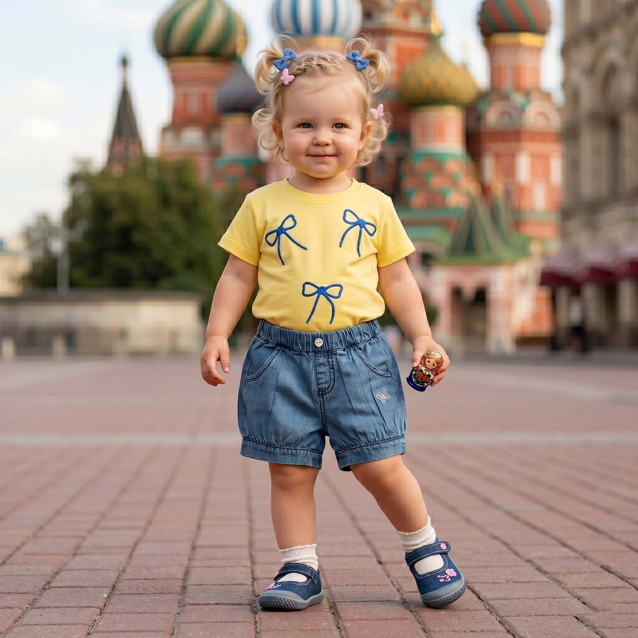 - The bold lemon-yellow base perfectly contrasts with the royal blue bows for a fresh, summertime aesthetic