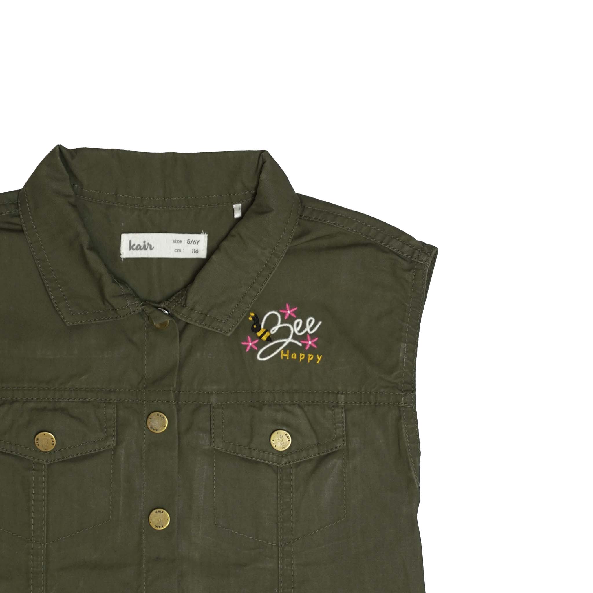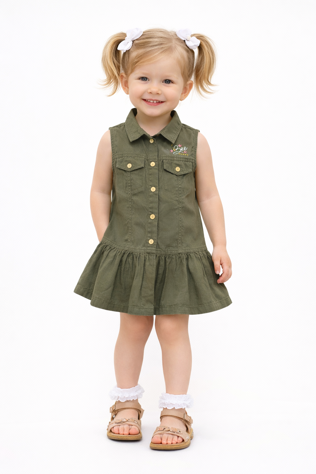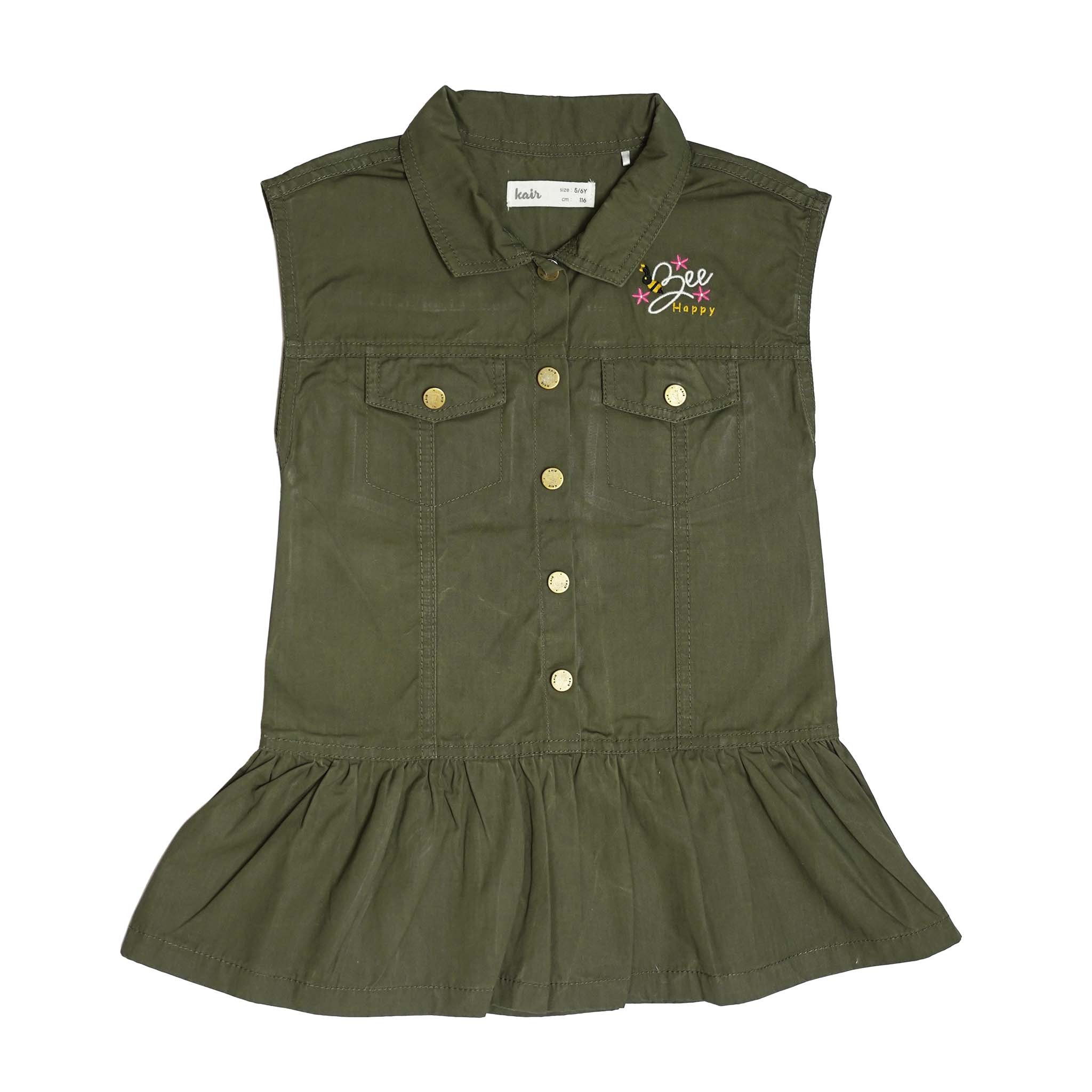 Detailed with front flap pockets and an embroidered chest design, it blends playful charm with utility-inspired elements. The softly gathered hem adds a subtle flared finish, creating movement and a flattering silhouette.
