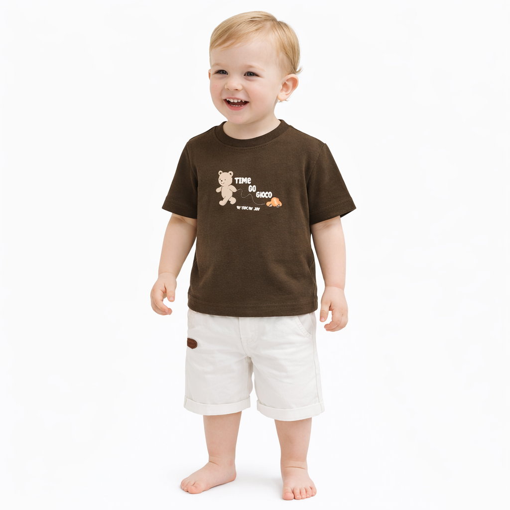 Add a cute and playful touch to your little one’s everyday wardrobe with this charming graphic T-shirt. Designed in a rich brown tone, it features a sweet bear illustration with a fun “Tempo di Gioco” (playtime) theme at the center. Made from soft, breathable fabric, this tee keeps kids comfortable all day while offering easy, relaxed style.